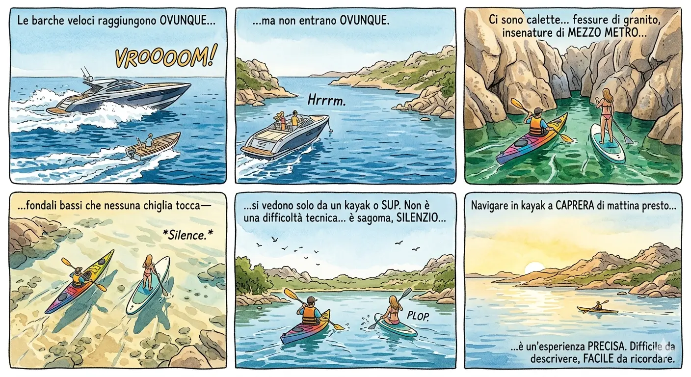 Kayaking around Caprera early in the morning — before motorboats leave, when the sea has that quality that lasts barely an hour — is one of the most precise experiences the archipelago offers. Precise in the sense of: hard to describe, easy to remember.