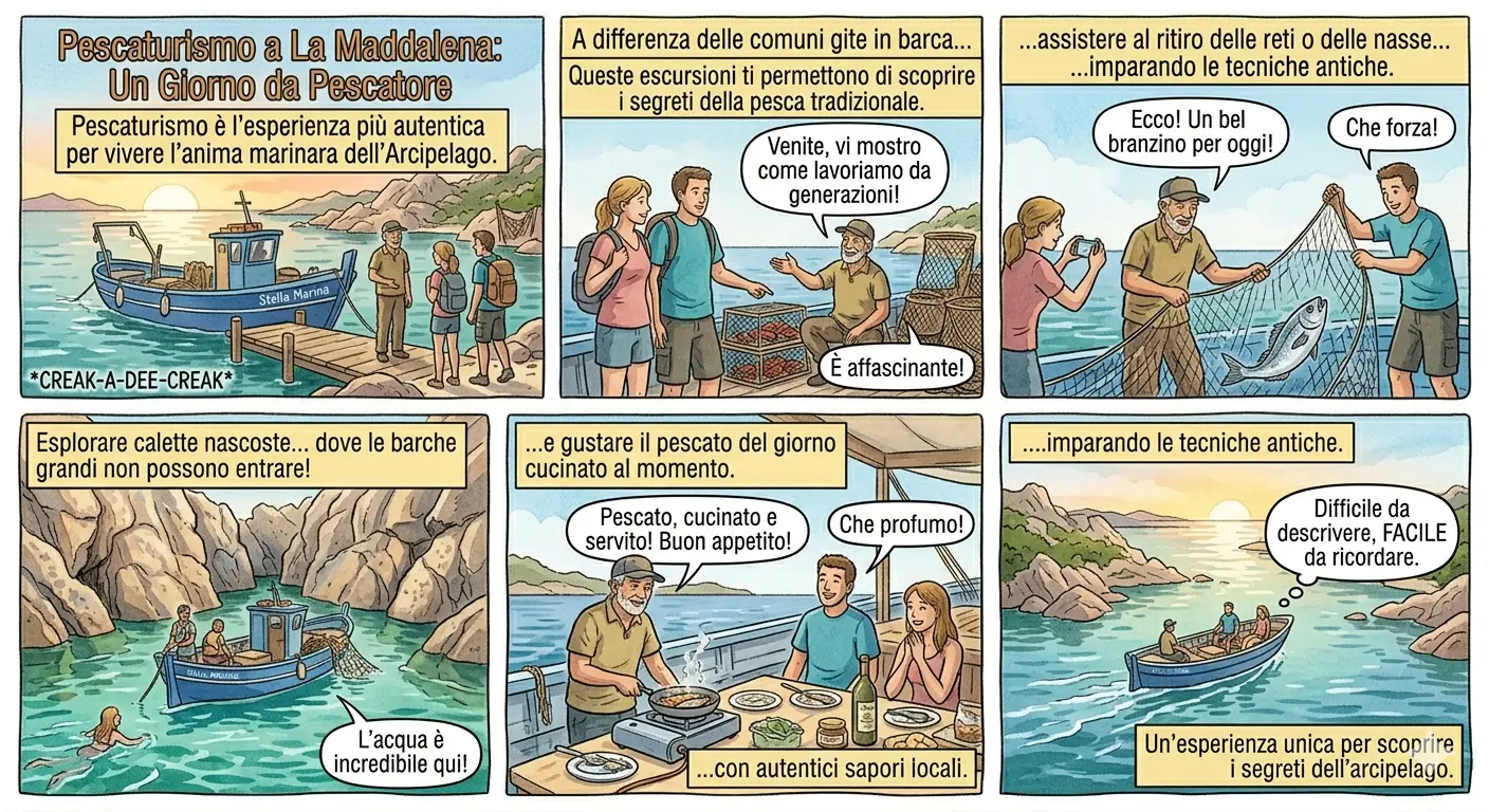 ⚓ Pescaturismo in La Maddalena: a day as a fisherman Pescaturismo is the most authentic way to feel the archipelago’s fishing culture. Unlike standard boat trips, you learn traditional methods, discover hidden coves, and often eat the catch cooked on board.