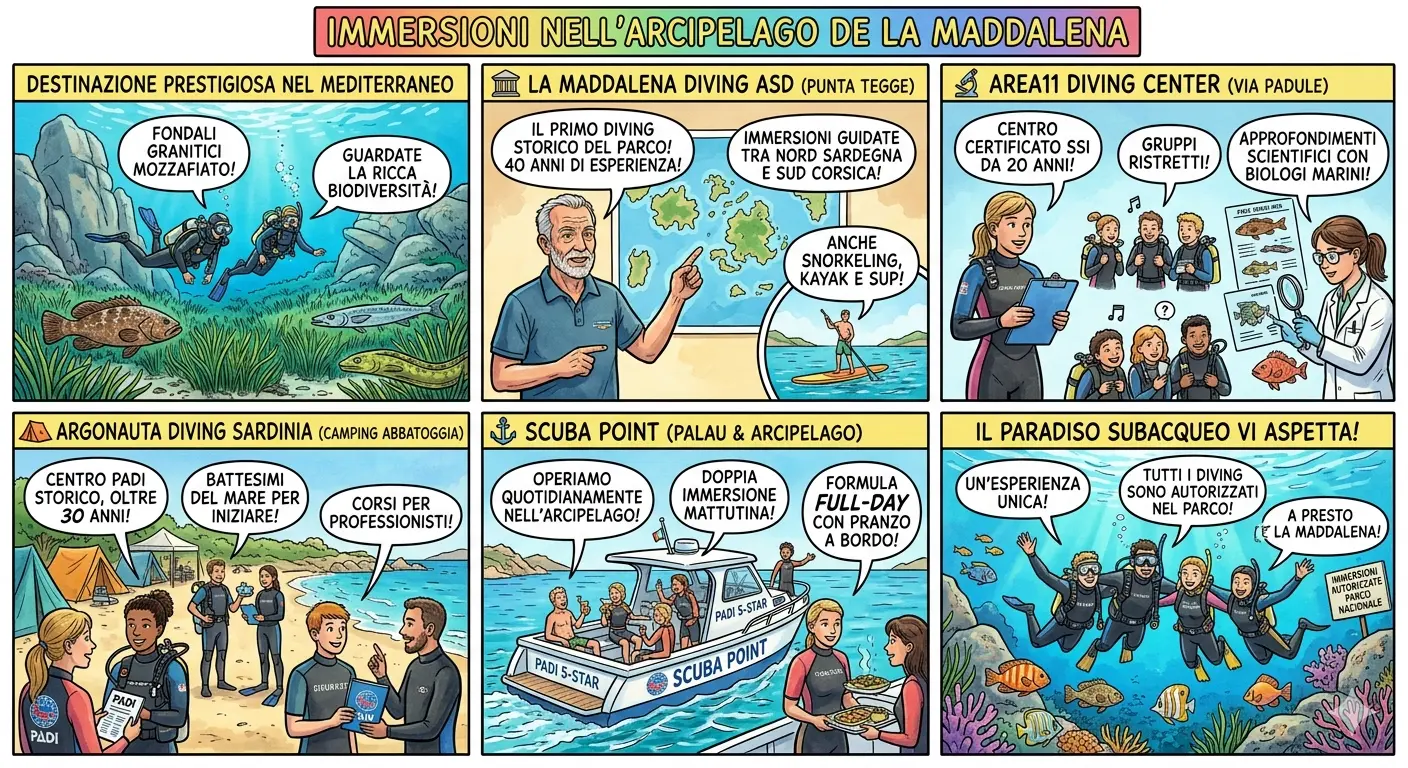 🤿 Immersioni nell'Arcipelago de La Maddalena L'Arcipelago de La Maddalena è considerato una delle mete subacquee più prestigiose del Mediterraneo. I suoi fondali, caratterizzati da spettacolari formazioni granitiche e praterie di posidonia, ospitano una straordinaria biodiversità che include cernie brune, barracuda e murene.
