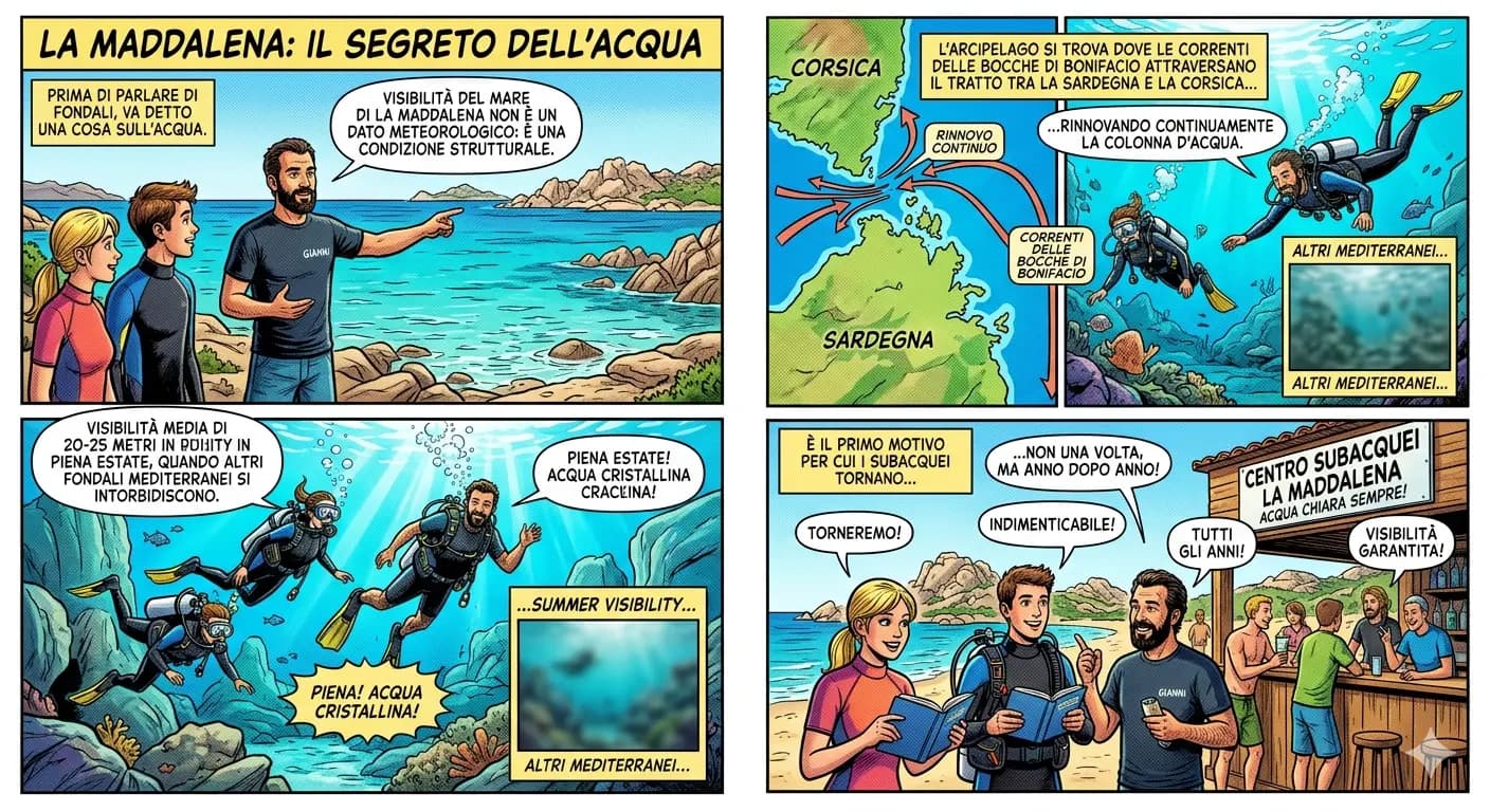 Prima di parlare di fondali, va detto una cosa sull'acqua. La visibilità del mare di La Maddalena non è un dato meteorologico: è una condizione strutturale. L'arcipelago si trova dove le correnti delle Bocche di Bonifacio attraversano il tratto tra la Sardegna e la Corsica, rinnovando continuamente la colonna d'acqua. Visibilità media di 20-25 metri in piena estate, quando altri fondali mediterranei si intorbidiscono. È il primo motivo per cui i subacquei tornano — non una volta, ma anno dopo anno.
