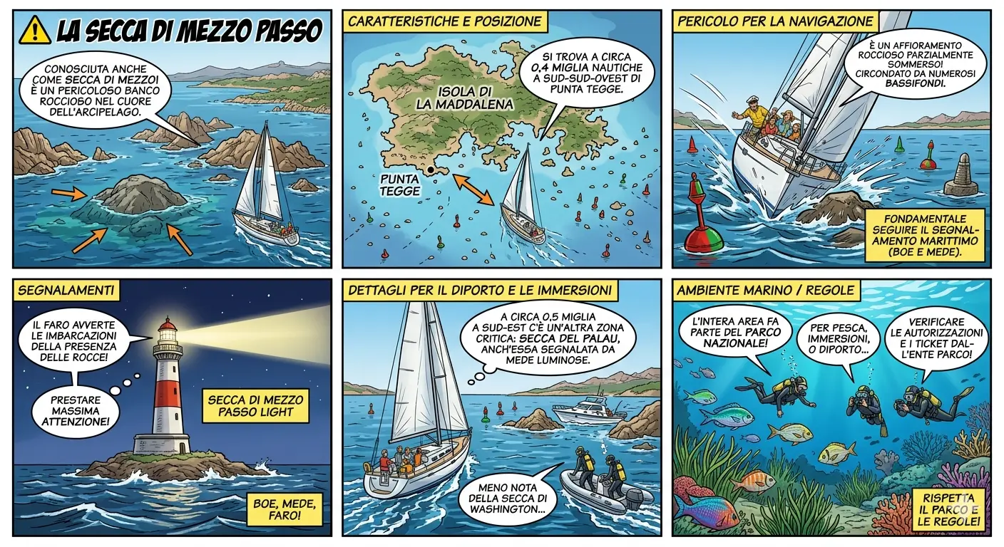 ⚠️ La Secca di Mezzo Passo La Secca di Mezzo Passo (spesso chiamata semplicemente Secca di Mezzo) è un pericoloso banco roccioso situato nel cuore dell'Arcipelago di La Maddalena, in Sardegna.