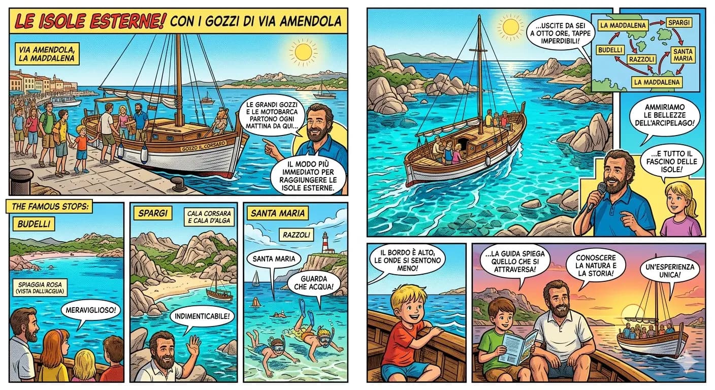 I grandi gozzi e le motobarca che partono ogni mattina da Via Amendola sono il modo più immediato per raggiungere le isole esterne. Uscite da sei a otto ore, tappe a Budelli (Spiaggia Rosa vista dall'acqua), Spargi (Cala Corsara e la Cala d'Alga), Santa Maria, Razzoli. Il bordo è alto, le onde si sentono meno, la guida spiega quello che si attraversa.