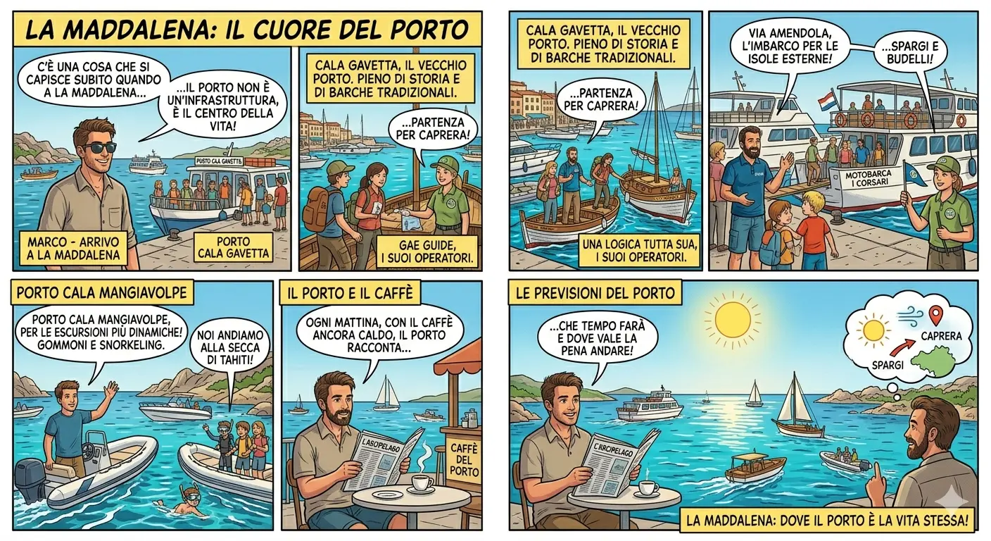C'è una cosa che si capisce subito quando si arriva a La Maddalena: il porto non è un'infrastruttura, è il centro della vita. Cala Gavetta, Via Amendola, Porto Cala Mangiavolpe — tre imbarchi , ognuno con la sua logica, le sue barche, i suoi operatori. Ogni mattina, con il caffè ancora caldo, il porto racconta che tempo farà e dove vale la pena andare.