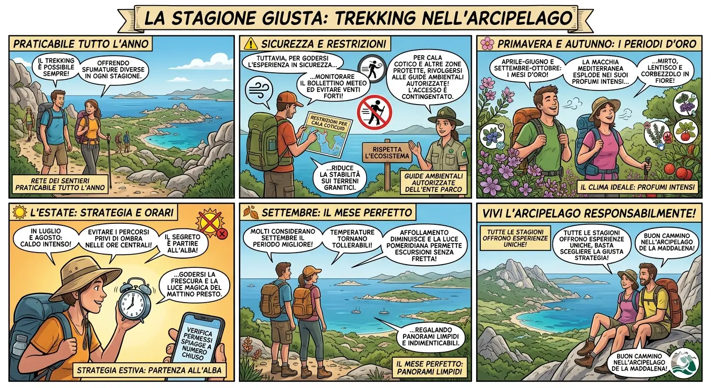 🥾 Quando camminare nell'Arcipelago Il trekking a La Maddalena e Caprera non ha un calendario restrittivo: la rete dei sentieri è praticabile tutto l'anno, offrendo sfumature diverse in ogni stagione. Tuttavia, per godersi l'esperienza in piena sicurezza, è fondamentale monitorare il bollettino meteo ed evitare le escursioni in caso di vento forte, che può rendere instabile il passo sui terreni granitici.
