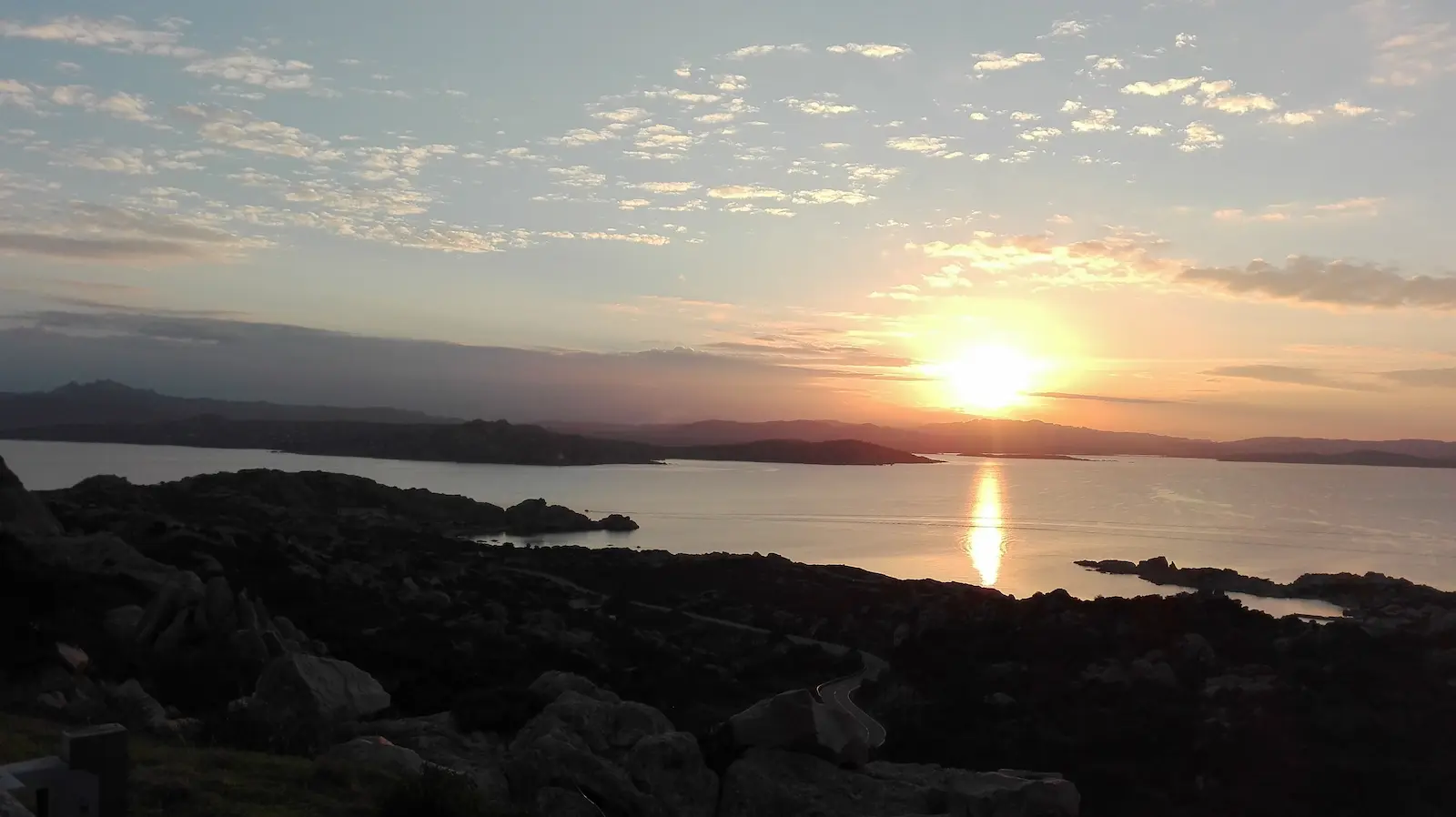 Il faro di Guardia Vecchia si trova sul punto più alto dell'isola principale, a 150 metri sul livello del mare, con esposizione ovest. Questo significa che guarda direttamente verso la Corsica e le Bocche di Bonifacio — con il sole che tramonta esattamente in quella direzione da maggio a luglio.