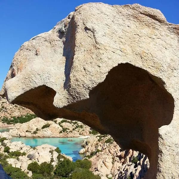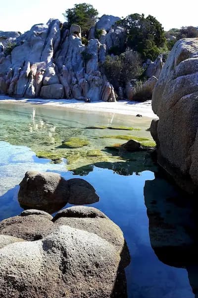 Cala Coticcio è la più famosa, la più piccola, la più custodita. L'acqua è di quella qualità che non si descrive senza sembrare imprecisi: trasparente fino al fondo, di un verde che diventa blu in poche bracciate. Si raggiunge a piedi dal parcheggio di Caprera (45 minuti su sentiero segnato) o in gommone. Arrivare all'alba significa averla per sé. Arrivare alle undici significa condividerla con i charter.